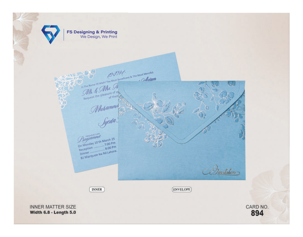 The soft blue color with embossed floral detailing gives this card a rich and elegant feel.