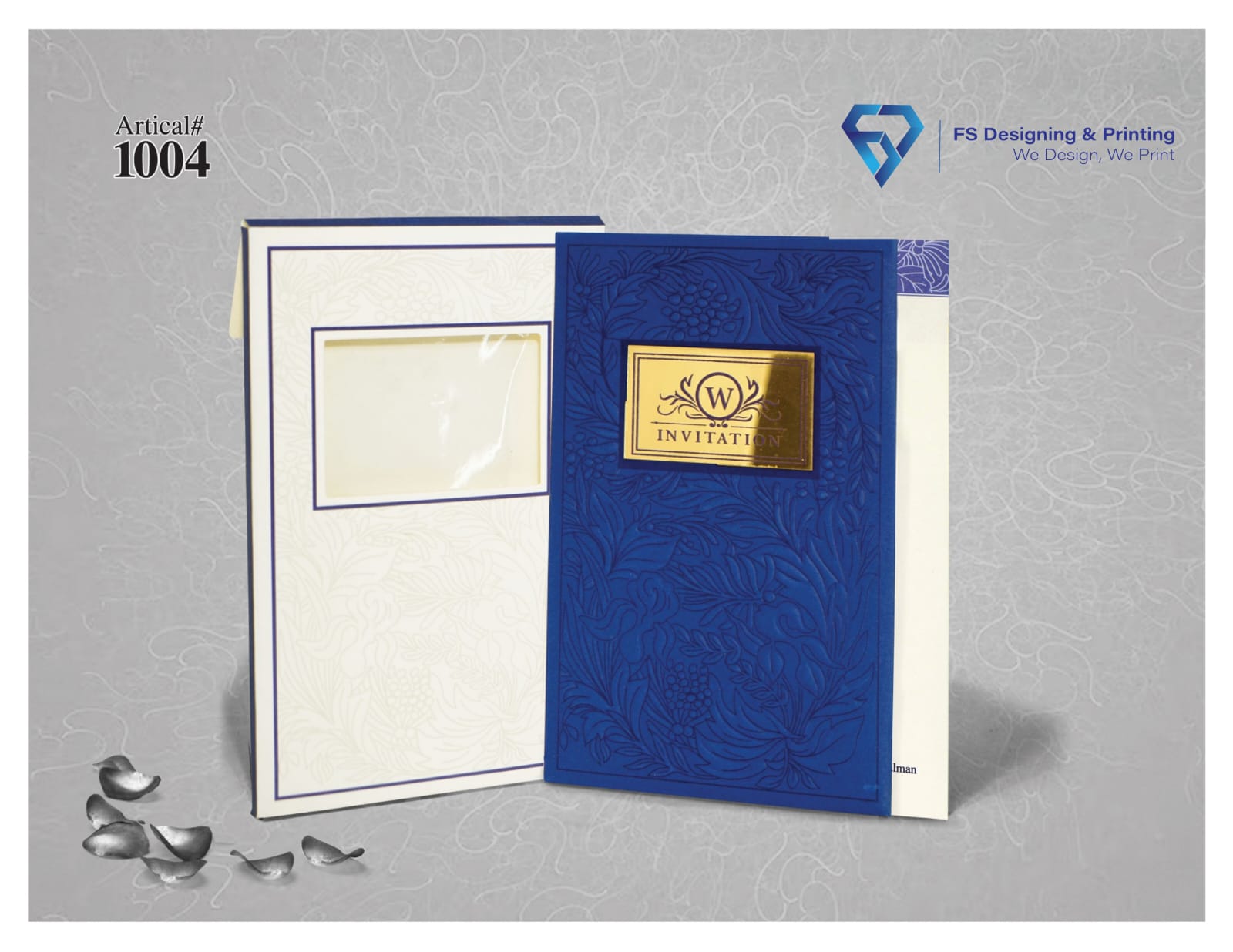 This elegant wedding invitation card features a rich royal blue color theme combined with subtle embossed patterns that create a refined and sophisticated appearance. The decorative gold plate on the front adds a luxurious touch, making it a perfect choice for stylish and modern wedding celebrations.