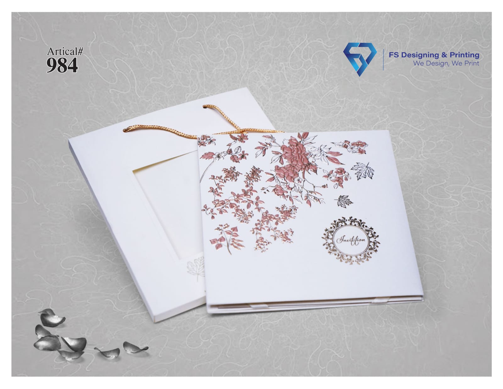 The invitation set comes with a matching presentation box and rope handles, giving it a refined and premium look. The clean layout, subtle decorative details, and high-quality printing ensure a classy and memorable presentation for announcing your special day.