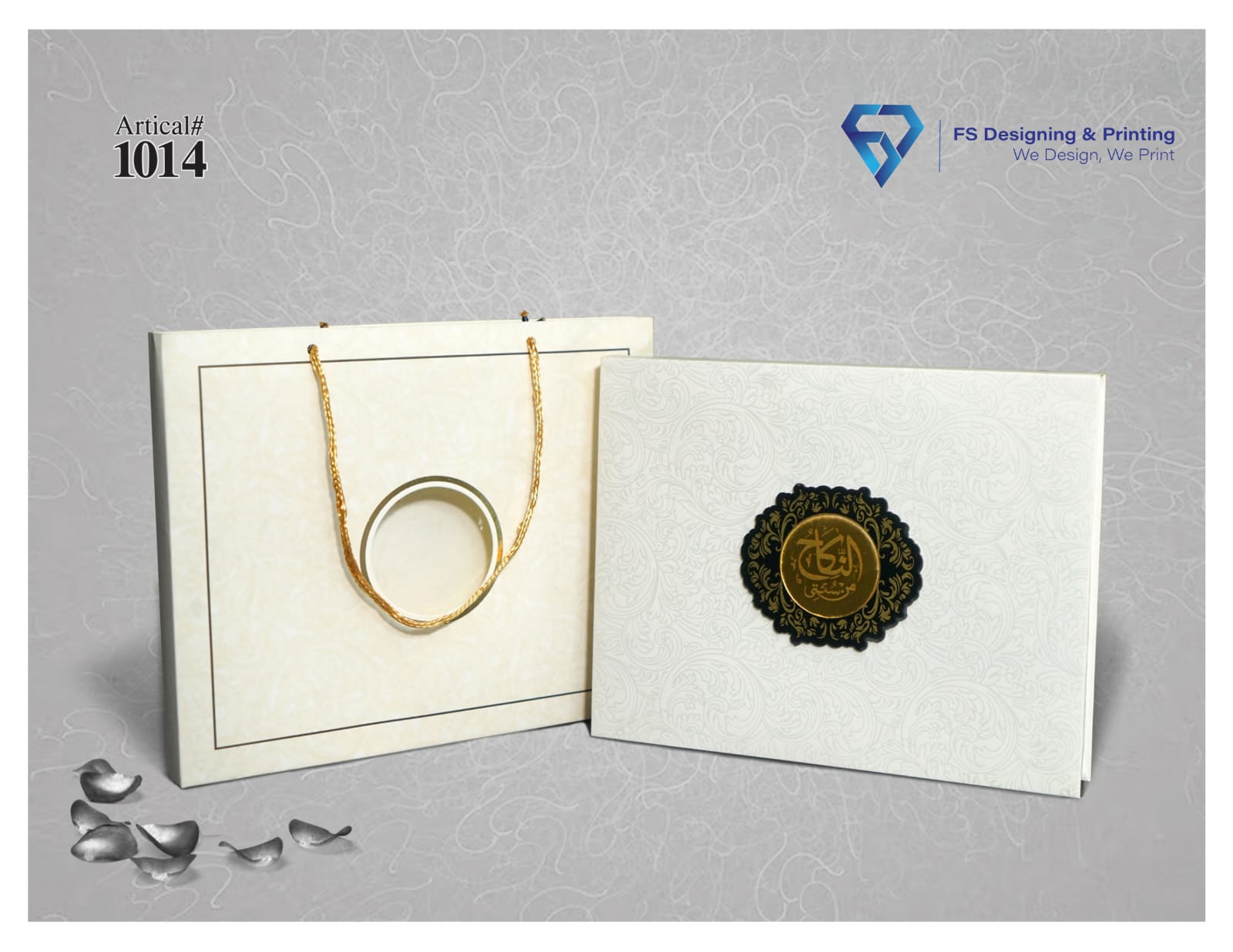 The invitation set includes a beautifully crafted matching presentation bag with golden rope handles, adding convenience and elegance for presenting the card. The clean white theme paired with gold accents makes this invitation both stylish and memorable for your guests.