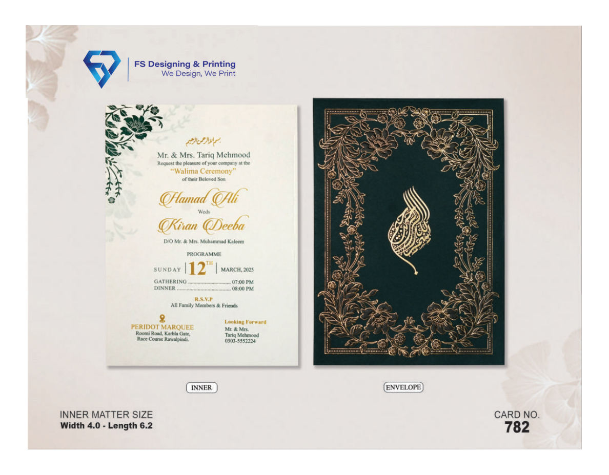 The inner card is beautifully balanced with soft botanical accents and refined typography, ensuring clear readability while maintaining an upscale appearance. This invitation is ideal for Walima, Nikah, and formal wedding ceremonies.