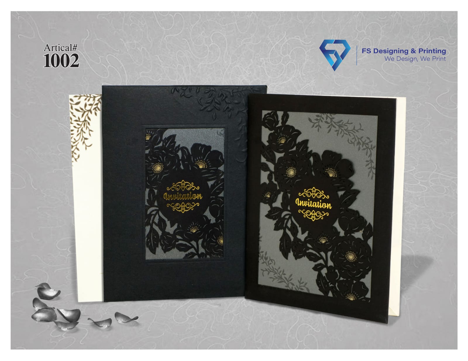 This luxury wedding invitation card features a bold black color theme combined with an intricate floral laser-cut design that creates a dramatic and sophisticated appearance. The detailed floral artwork with elegant golden accents adds a royal and stylish touch, making it a perfect choice for modern and premium wedding celebrations.