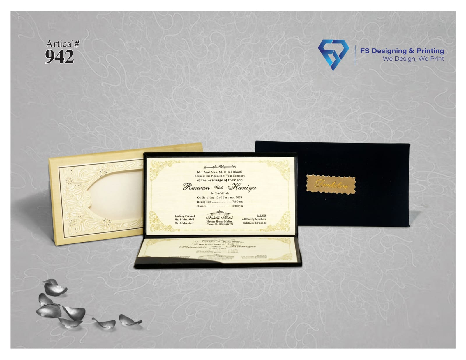 The inner card showcases a beautifully organized layout with decorative gold borders and refined typography that enhance the overall presentation. The premium printing quality and stylish design give this invitation card a professional and luxurious look, ensuring your wedding announcement leaves a memorable impression on your guests.