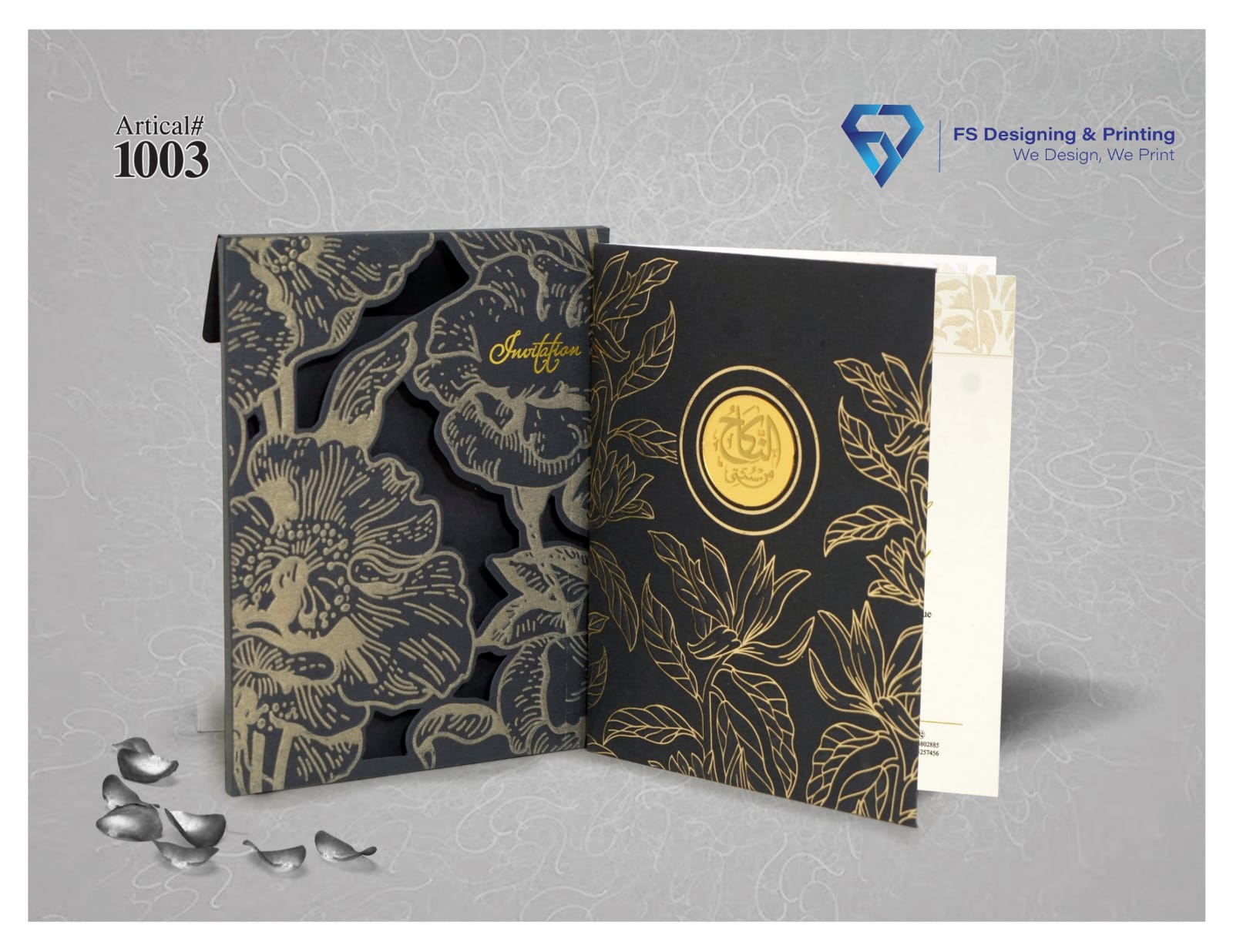 This luxury wedding invitation card features a bold black color theme combined with intricate gold floral artwork that creates a striking and sophisticated appearance. The elegant floral patterns and decorative golden emblem on the front add a royal and stylish touch, making it a perfect choice for modern and luxurious wedding celebrations.
