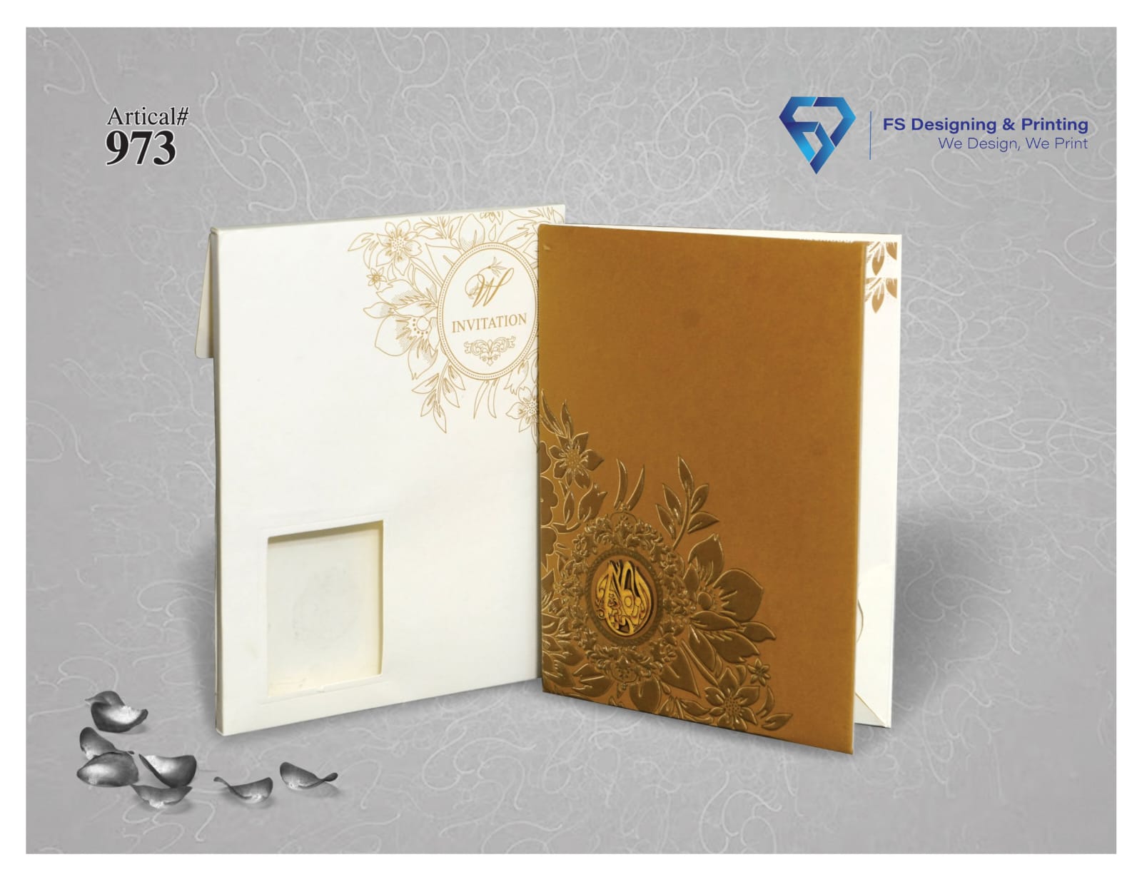 This luxury wedding invitation card features a rich golden color theme combined with elegant floral artwork that creates a sophisticated and graceful appearance. The beautifully detailed floral patterns with a central decorative emblem add a royal touch, making it an excellent choice for traditional and stylish wedding celebrations.