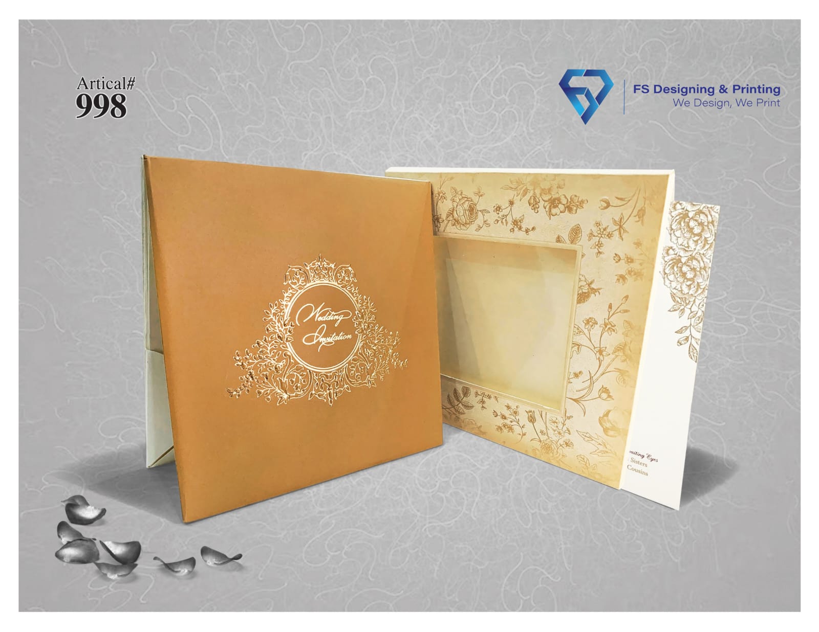 This luxury wedding invitation card features a rich golden color theme enhanced with elegant floral artwork that creates a graceful and sophisticated appearance. The beautifully designed ornamental frame on the front adds a royal touch, making it a perfect choice for classic and elegant wedding celebrations.