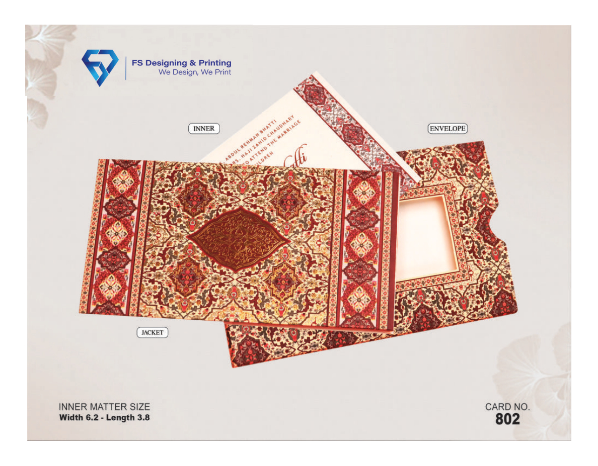 This traditional red wedding invitation is inspired by classic Mughal and Persian carpet patterns, giving it a rich cultural and royal appearance. The jacket features an intricate geometric and floral design with a central ornamental motif that instantly adds grandeur to the invitation.